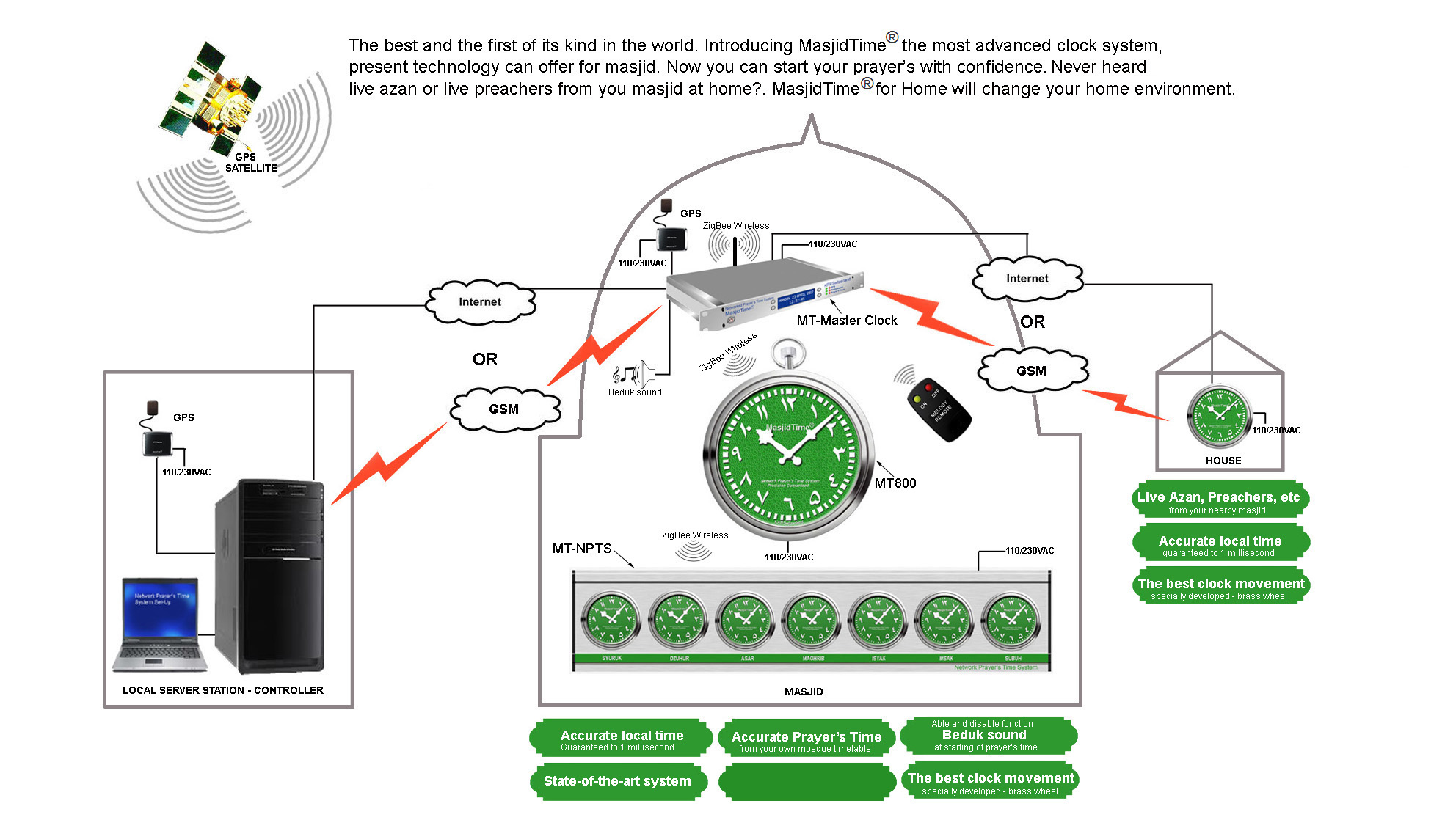 Masjid Network Time System features a complete requirement for Masjid: - very accurate current time, very accurate prayer’s time taken from your own masjid prayer’s timetable, setting of prayer’s time done through local server, fully automatic, no resetting required, long lasting, all components are from the best quality, able to listen to live Athan and preachers from your mosque and get accurate time at home.